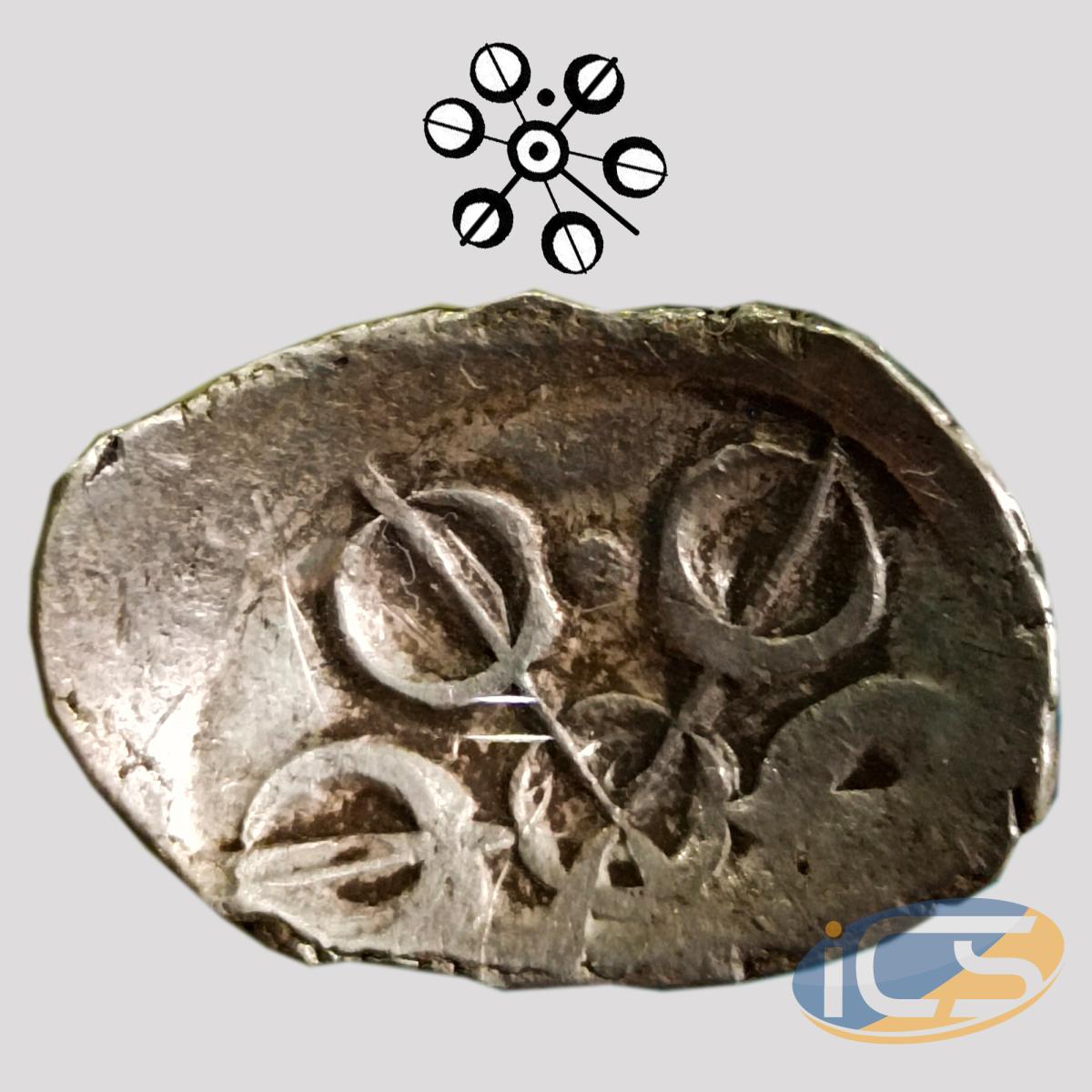 Ancient India, Gandhara Janapada (600-300 BC), Punch Marked Coin, Silver Shana, 1/8 Shatamana, 1.16 gms, Obv six petaled flower symbol with additional dot, Rev uni-face, Rajgor Series 41 # 570,