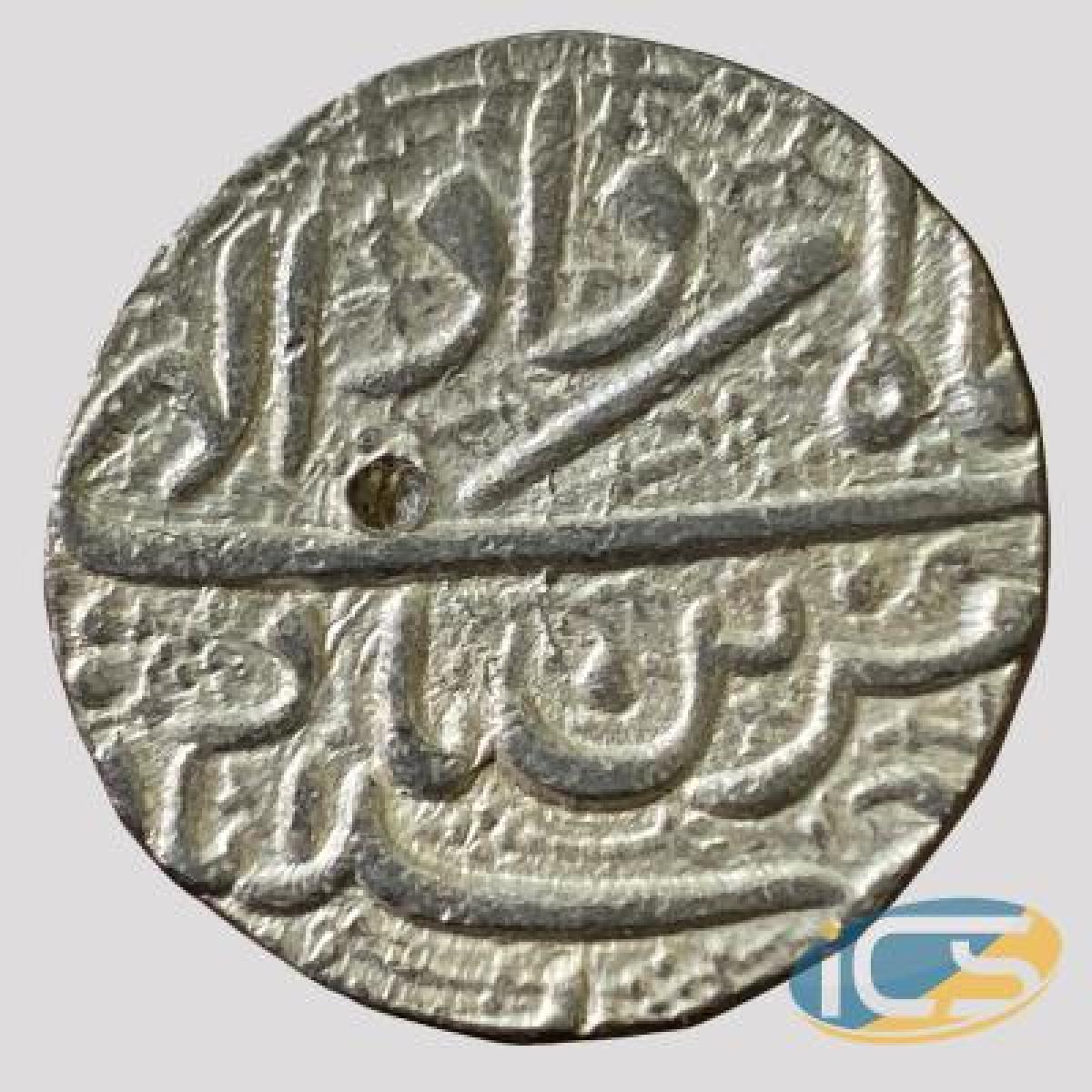 The couplet may be translated as: In the name of Nur al-Din Jahangir /struck at Ahmadabad, the beautified city, in the month Amardad of the Ilahi.